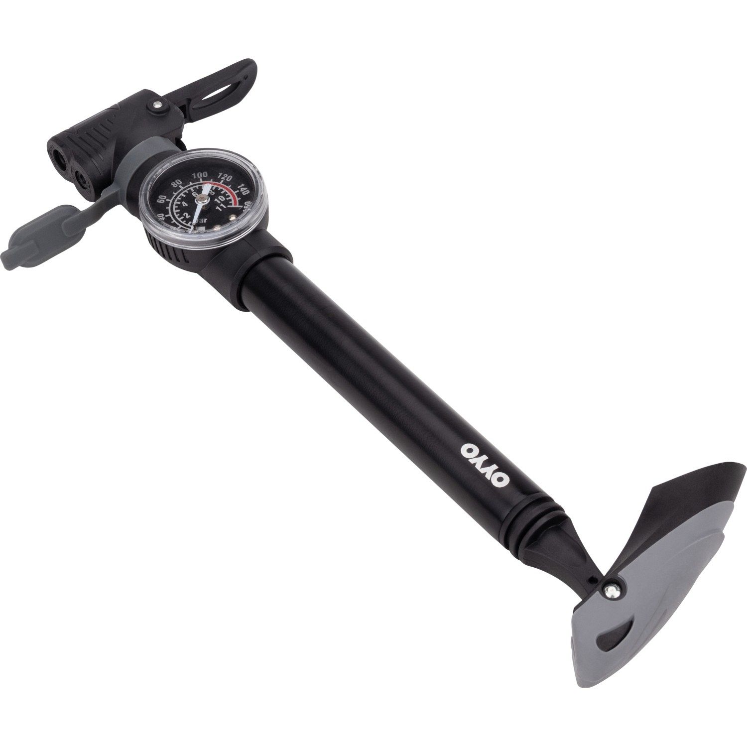 Ручной мини-насос с манометром OYYO PP30 – стильный, компактный аксессуар, созданный из ударопрочного пластика и алюминия. Его конструкция допускает работу с ниппелями Presta (вело) и Schrader (авто) – универсальность применения для разных моделей велосипедов. Двухголовая система упрощает переключение между вентилями.