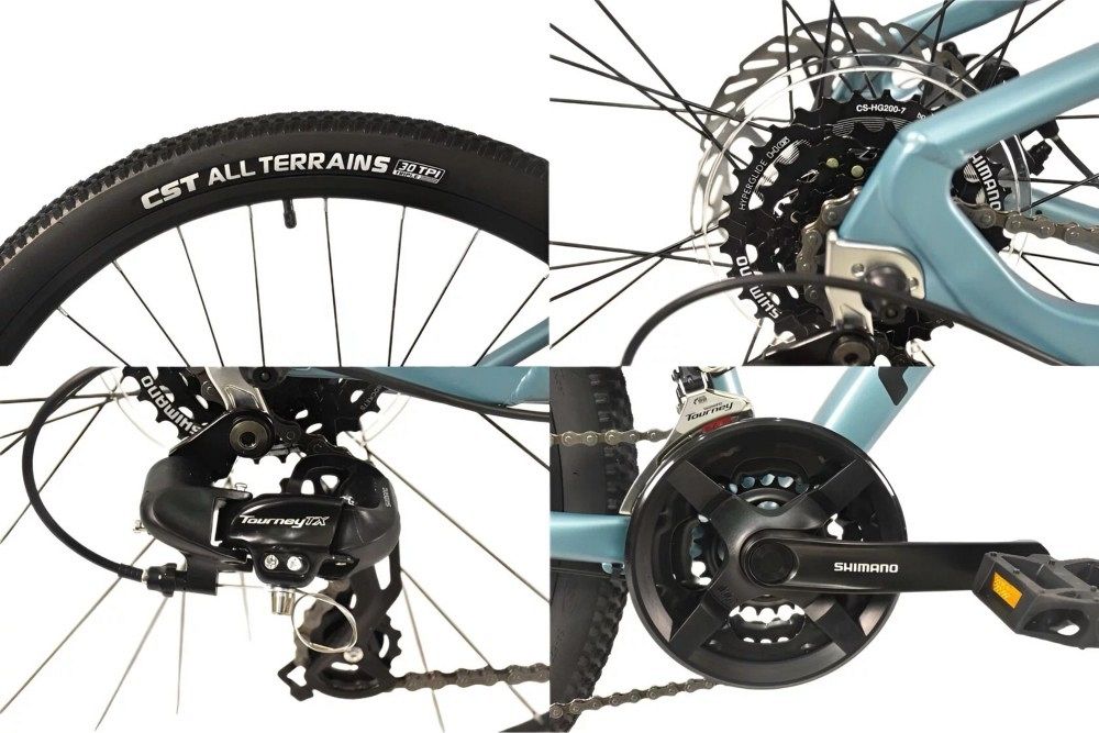 Алюминиевые двойные обода HJC-RP170 и втулки на промподшипниках создают надёжность и долговечность, а дисковые механические тормоза создают мощное и надёжное торможение в любых условиях. Покрышки CST All Terrains 2.1 создают отличное сцепление с дорогой и уверенность на любых поверхностях. Педали на промподшипниках и подножка добавляют удобство и практичность, а вес велосипеда всего 14,4 кг делает его лёгким и манёвренным.