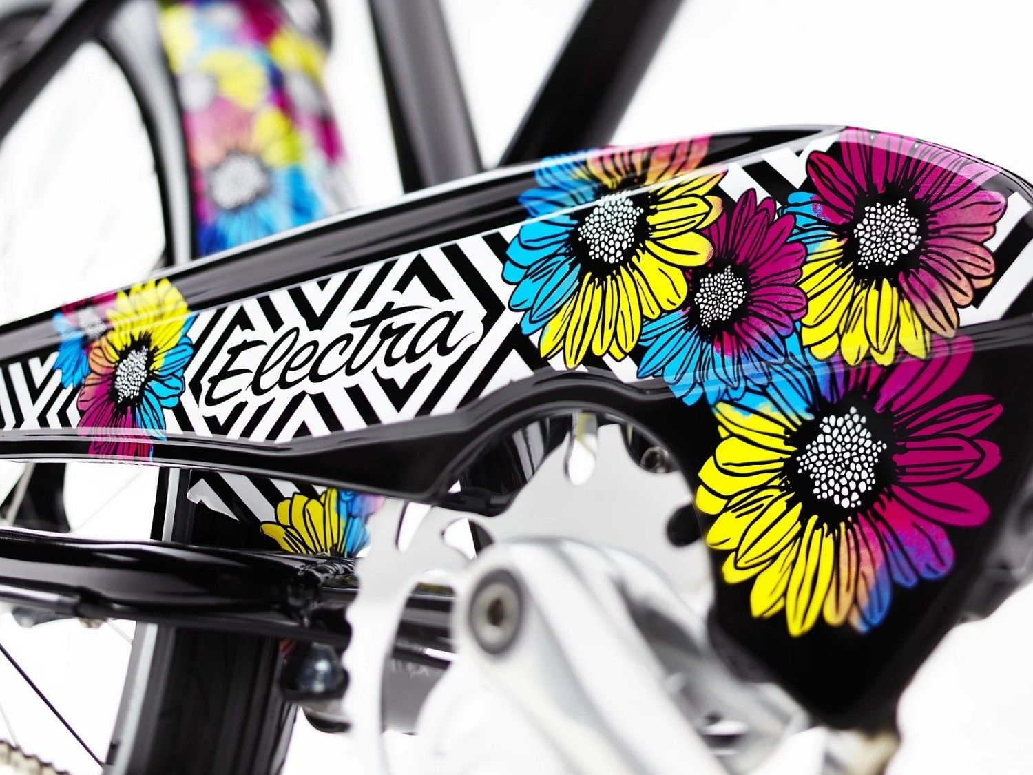 В основе дизайна Electra Andi 3i лежат знаменитые работы Уорхола: "Flowers" и шелкография "Zebra". Удивительные детали делают этот велосипед уникальным и неповторимым. Если внимательно разглядывать цветы, расположенные на раме, крыльях, защите цепи и звонке, можно увидеть характерное для шелкографии нанесение, которое использовал Энди Уорхол в своих шедеврах.