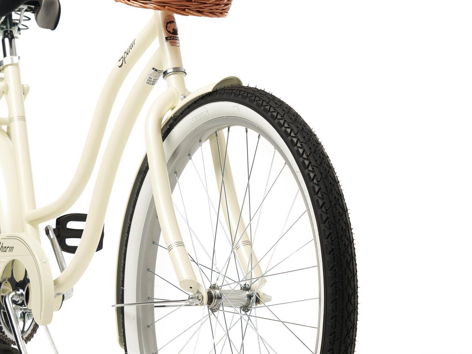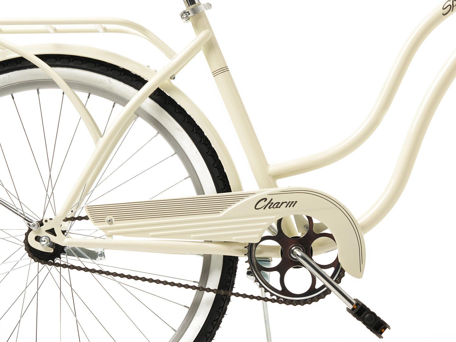 Велосипед оснащён 26-дюймовыми колёсами с покрышками Spinn Tire 26x2.125" с белыми полосами, что придаёт ему стильный и элегантный вид. Задний ножной тормоз добавляет удобства и безопасности. В комплект входят крылья, багажник и звонок, что делает Charm готовым к использованию прямо из коробки.