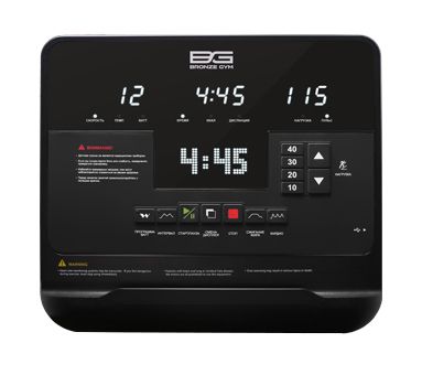 Тренировочный компьютер на Bronze Gym R1200M PRO представлен многофункциональным матричным LED-дисплеем диагональю 15,6 дюймов. Основной экран дополняют 3 небольших буквенно-цифровых LED-дисплея. На мониторах отображаются следующие данные: время, скорость, дистанция, уровень нагрузки, расход калорий, пульс, темп, Ватт. Все клавиши и дисплеи оснащены белой подсветкой, а надписи русифицированы. В число тренировочных режимов входит кардиотренировка, интервальная программа, Ватт-программа и программа сжигания жира. Помимо предустановленных программ, можно воспользоваться самостоятельно регулируемым ручным режимом.