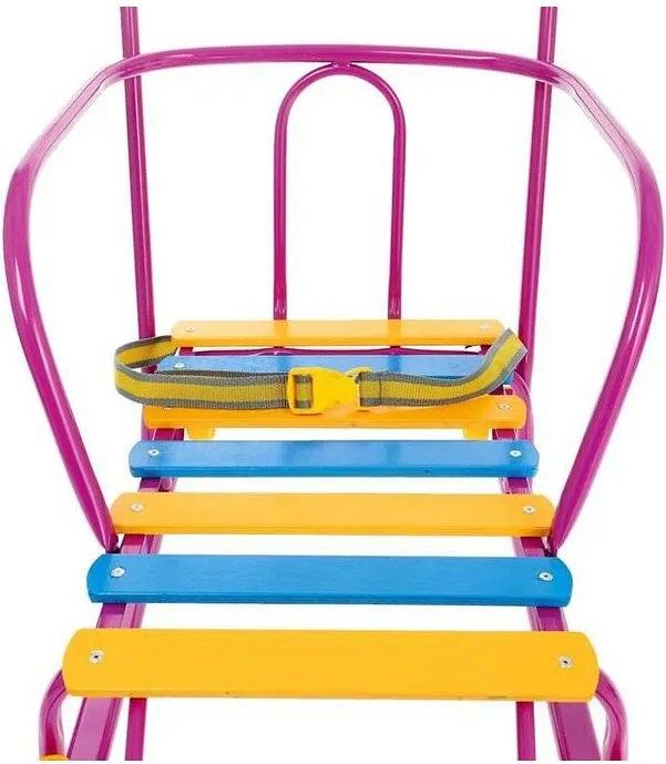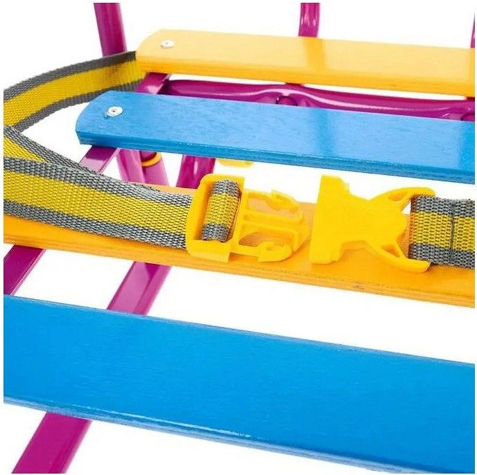 Материалы, используемые в санках: металлическая рама, деревянное сиденье, ремень безопасности из ременной ленты и морозостойкая пластмасса для колес.